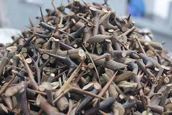 皂刺為豆科植物皂莢的干燥棘刺,全年均可采收,干燥,或趁鮮切片,干燥。皂刺為主刺及1~2次分枝的棘刺。主刺長3~15cm或更長,直徑0.3~1cm;分枝刺長1~6cm,刺端銳尖。表面紫棕色或棕褐色。體輕,質(zhì)堅硬,不易折斷。切片厚0.1~0.3cm,常帶有尖細的刺端。
