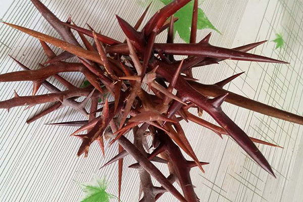 皂刺為豆科植物皂莢的干燥棘刺,全年均可采收,干燥,或趁鮮切片,干燥。皂刺為主刺及1~2次分枝的棘刺。主刺長3~15cm或更長,直徑0.3~1cm;分枝刺長1~6cm,刺端銳尖。表面紫棕色或棕褐色。體輕,質(zhì)堅硬,不易折斷。切片厚0.1~0.3cm,常帶有尖細的刺端。
